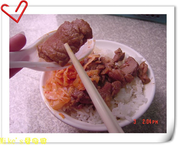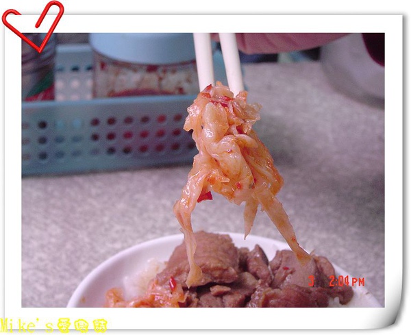 經過長時間的燉煮,這時候的肉塊不但吸滿了滷汁的香氣與甘甜味,放入口中一咬更是馬上入口即化,不會有柴柴澀澀的口感,很特別的是店裏頭有老闆自製的泡菜,因為怕顧客貪心拿太多吃不完浪費,因此規定每次要拿泡菜只能用塑膠湯匙裝,吃多少裝多少,雖然是用高麗菜來醃製泡菜,簡單的配料吃起來就是很有台式風味的口感,微辣的感覺又有嚼勁,不論是配著魯肉飯來吃,或是加在肉羹湯內,都是很棒的吃法,而且會忍不住一口接一口欲罷不能!