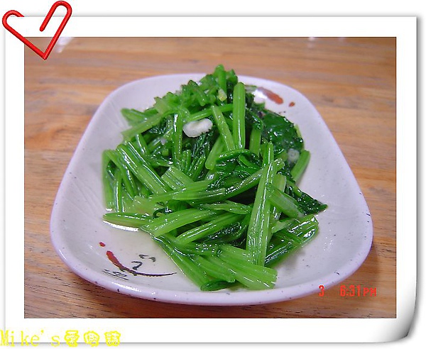 至於燙青菜,不管是空心菜、波菜、地瓜葉或A菜,老闆都選用最鮮嫩的部分,用滾水稍微川燙後撈起,放在鍋子裏伴入雞油、蒜末和少許的調味料,稍微攪拌入味後就盛盤上桌,這時熱騰騰的吃上一口,會發現這裏的燙青菜比用炒的,來的更香更好吃,而且青脆無比。