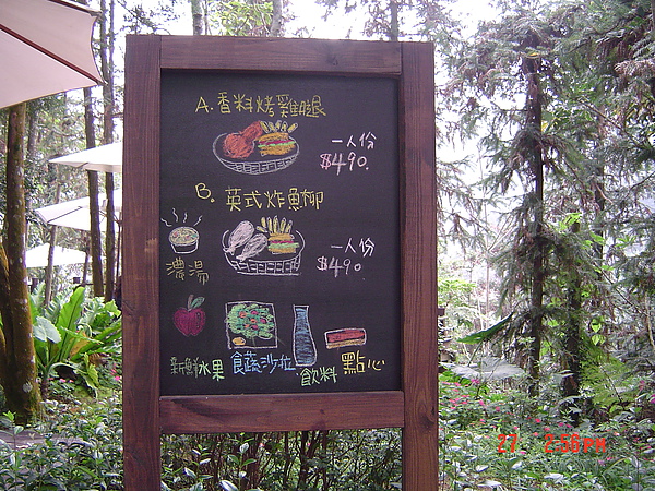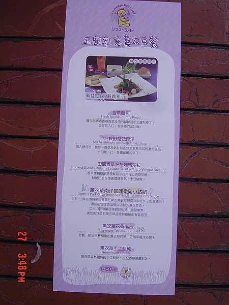 這回因為好友第一次來到新社心情特好,因此我們特別點了一份主廚創意的薰衣草餐和一份香料烤雞腿野餐組(因為有送一個可愛的木製餐盒),當天由於人潮頗多,因此野餐組需要經過陡坡到上方的野餐區取餐,然後我們在走回下方的戶外用餐區,等候主廚的創意料理,這一等還讓我們等了頗久,要不是好友的好興致,對於他們有點混亂的外場服務,早就喪失享用大餐的雅興了。
