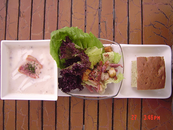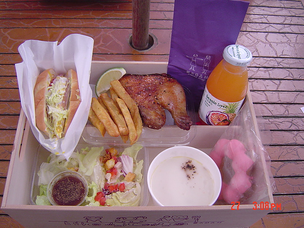 對於這可愛的野餐組,好友是抱著期待又興奮的心情,然而真正品嚐餐點後,卻有著很大的失落感。雖然這是一個豐富又很特別的餐點設計,但仔細觀察,不管是主菜香料雞腿的口感與外觀上,香草的氣味沒有入到雞腿肉裏,吃起來也沒有皮酥脆肉軟嫩的感覺,整個令人相當失望,再加上搭配的麵包、蔬菜沙拉和濃湯的精緻度上,都讓人覺得有些草率和隨便,想當然也不怎麼美味可口,倒是果汁和甜甜圈是令人欣慰的。